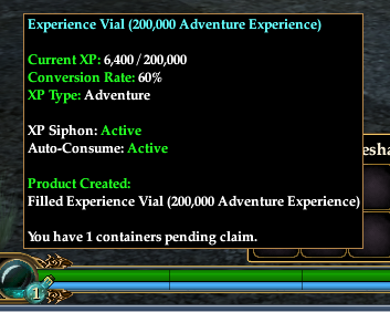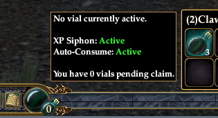 Once you have filled up your Experience Vial, the counter on the vial will go up, indicating you have a filled vial to claim. In the case below you will note that the system auto-consumed one of my remaining empty vials and is continuing to siphon experience points.