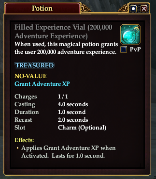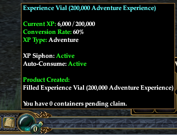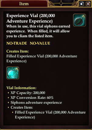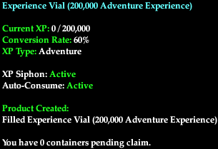 You may now right click and claim your filled experience vials, which may be traded or consumed at your leisure. Experience granted from a vial works in all ways as if you earned it from a quest or defeating a creature, and thus will grant tithe, or can be converted into AA experience depending on how you have your experience slider set.