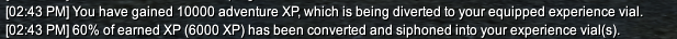 While the system is active, your experience point earnings will be explained in detail in the chat window. In the example below I have earned 10,000 adventure XP, which is then converted into 6,000 XP and stored in the currently-active vial.